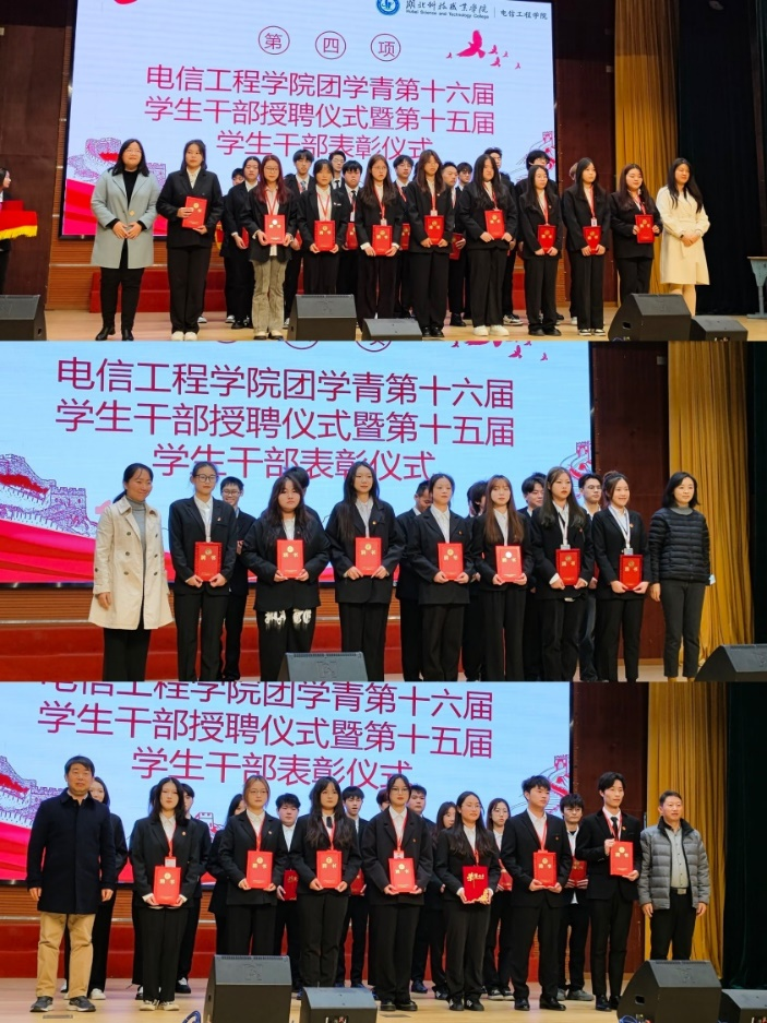 在大会顺利完成各项议程后,电信工程学院举行新一届分团委、学生会和青年志愿者协会学生干部授聘仪式,由莅临大会的各位领导及嘉宾分别为三大组织的新一届学生干部颁发聘书,并为上一届学生干部颁发荣誉证书。