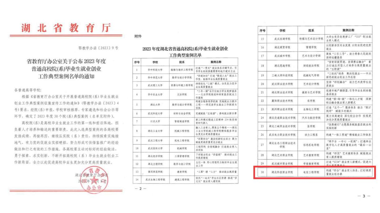 本网讯(通讯员 王东瑾 向珅玓 文/图)10月8日,湖北省教育厅办公室下发《关于公布2023年度普通高校院(系)毕业生就业创业工作典型案例名单的通知》(鄂教学办函〔2023〕9号),我校电信工程学院申报的案例《构建“四全”就业育人体系,打好高质量就业组合拳》入选,成为入选的30个高校院(系)典型案例之一,11家高职院(系)之一。