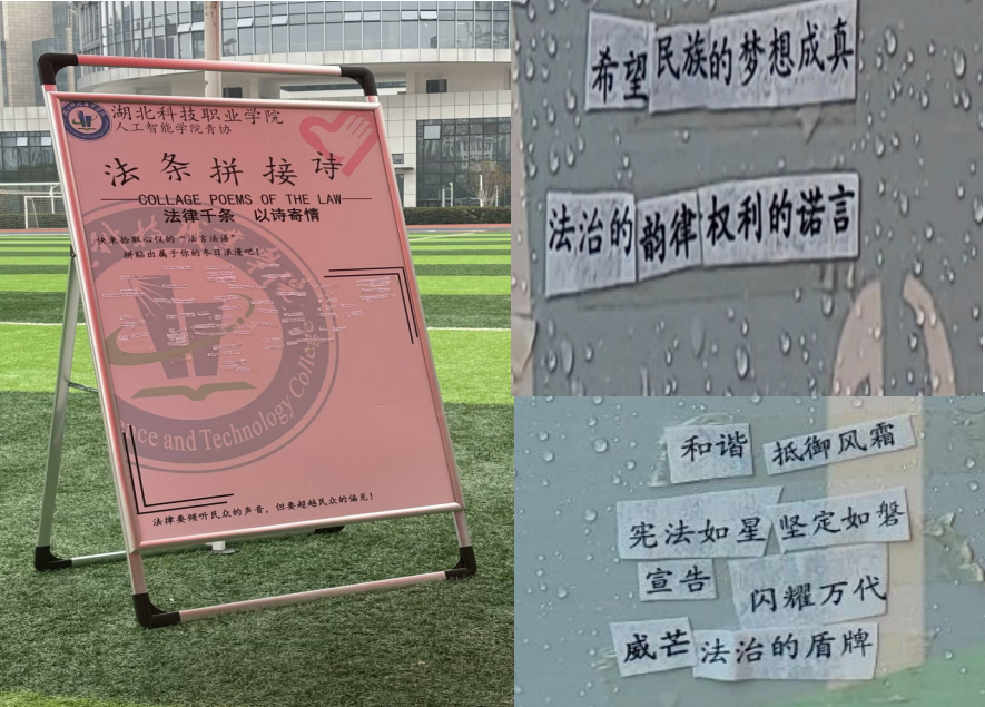 3.法条拼接诗,体会宪法温度。为提高同学们对法律的兴趣,推动普法宣传教育,人工智能学院特面向全校学生举办“法条拼接诗”活动,参与者在准备好的诗句和词语素材中自由选取,发挥想象力和创造力进行创意拼贴。严谨的法条与诗歌的浪漫,碰撞出一首首独一无二的小诗。参与者杨彩霞表示:“通过贴法条与艺术创作结合这样新颖的方式,拉近了我们与法律的距离,在学习法律知识的同时还能够陶冶情操,一举多得。”