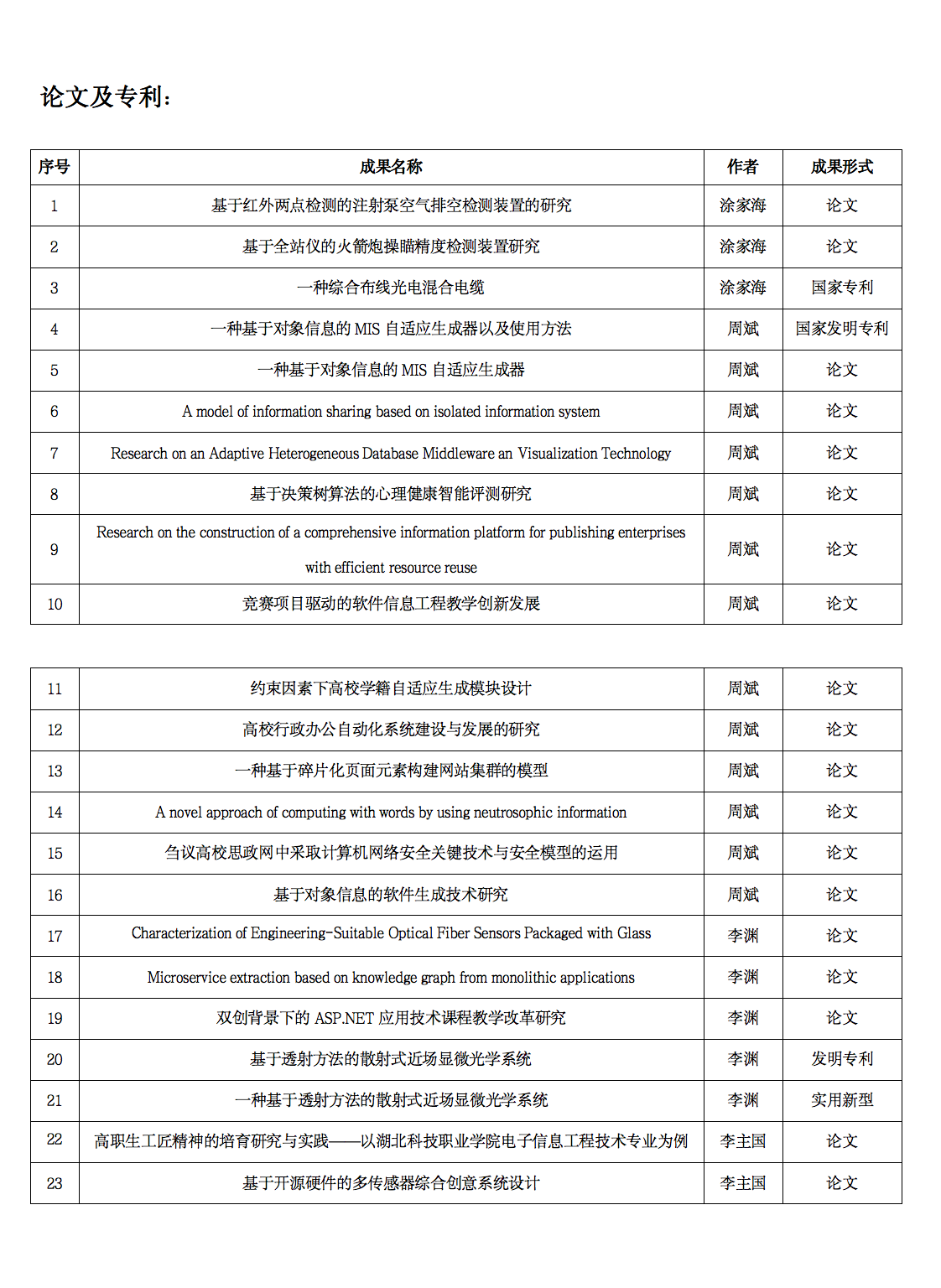 团队承担教育部产学研创新基金《基于人工智能的校园助手研究》项目、科技部国际合作专项《太赫兹时域光谱仪》项目,湖北省教育厅《切趾同轴电缆布拉格电栅》项目,团队成员骨干参与国网总部研发项目、国自然等多项课题,发表论文10余篇,其中SCI期刊3篇、EI 1篇、专利3项、软著2项,团队成果转化获国家级A类竞赛项目国赛奖项3项(“互联网+”创新创业大赛、“挑战杯”),省赛金奖5项(“工匠杯”、“烽火杯”、“互联网+”创新创业大赛、“挑战杯”等)。