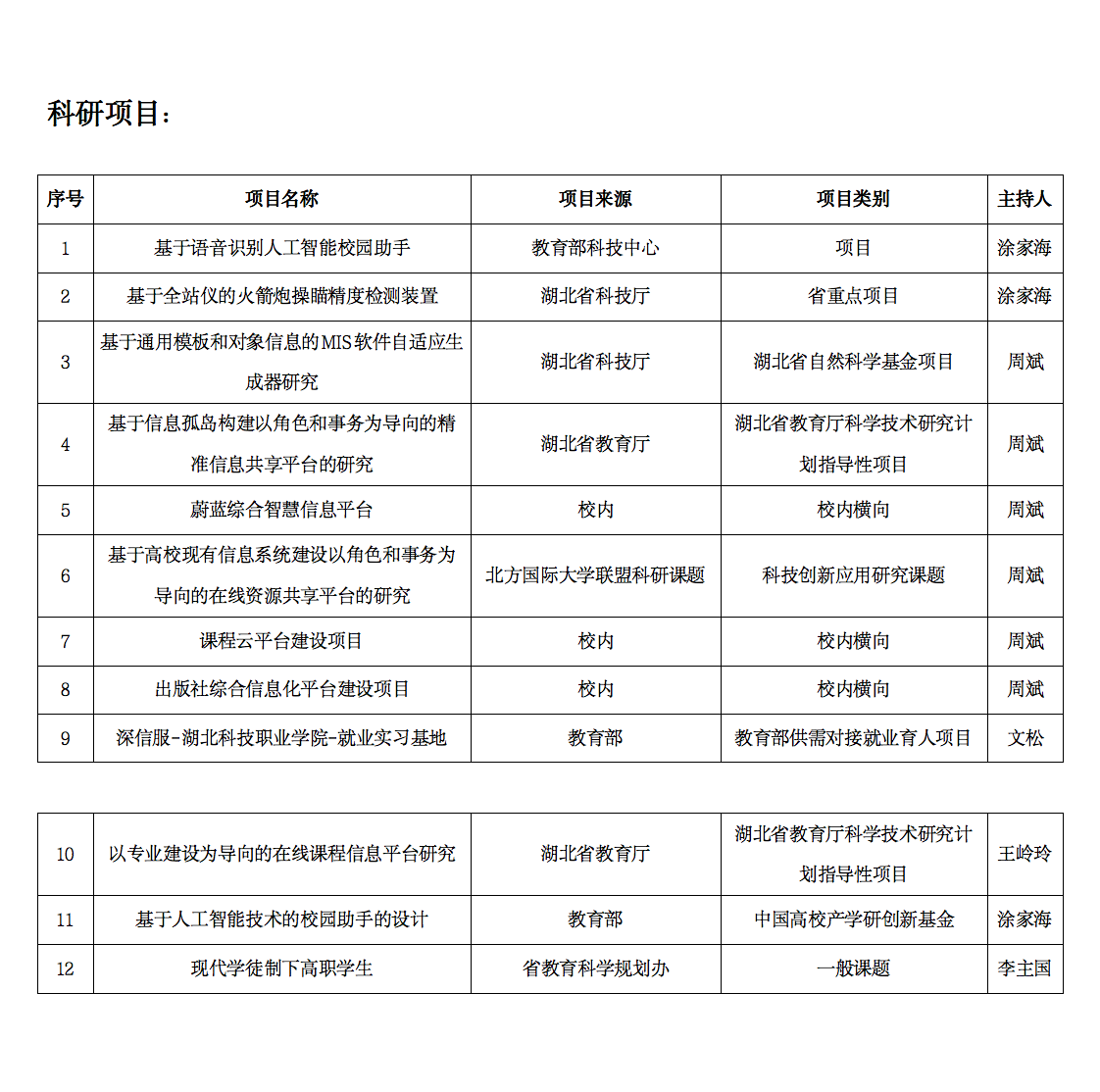 2021 年 9 月,湖北开放大学(湖北科技职业学院)(湖北科技职业学院)事业发展“十四五”规划指出要“创新发展、特色兴校”,聚焦智能制造、信 息技术特色专业,打造优势专业群,要提升教学研究、科学研究水平,产出更多高水平研究成果。在这样的背景下,为抓住人工智能发展的重大战略机遇,构筑人工智能技术应用高水平专业群先发优势,2022年9月,成立了校级科研机构“人工智能技术应用创新中心”,下设“智能计算平台应用和监测数据处理研究与应用”“信息安全技术研究与应用”“数字化信息管理系统研究与应用”等3个科研团队,由电信工程学院负责日常运行和业务管理。