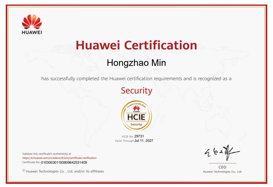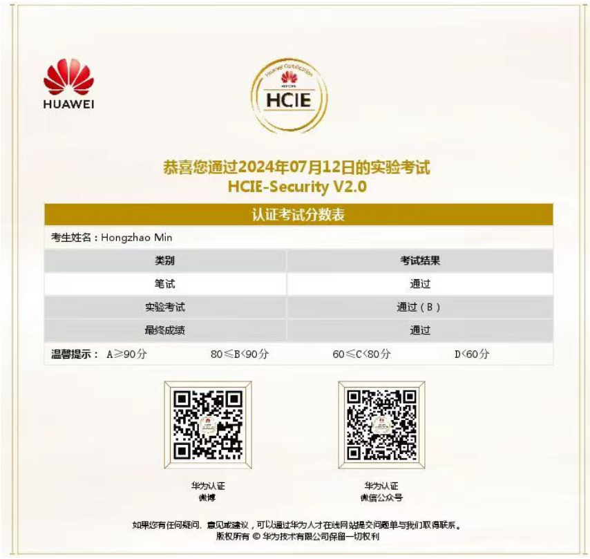 本网讯(通讯员 尹淑玲 文/闵鸿钊 图)近日,我校电信工程学院信息安全技术应用专业2021级学生闵鸿钊通过HCIE笔试和实验考试两个阶段认证环节,一次性通过了华为Security方向HCIE认证,我校华为HCIE专家认证又添一人。