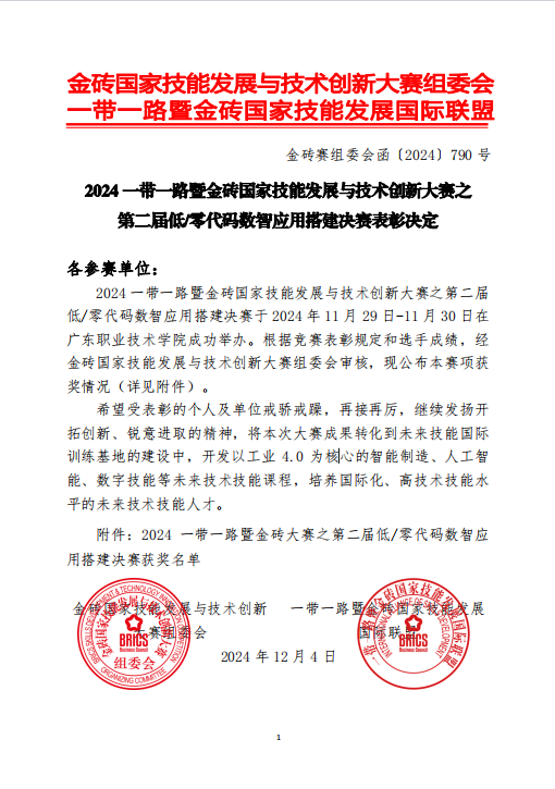 本网讯( 通讯员 辛玲 文/图)11月29日至30日,金砖国家技能发展与技术创新大赛之第二届低/零代码数智应用搭建决赛在广东职业技术学院举办。来自全国的216支高职院校队伍和65支本科队伍参加角逐,人工智能学院师生在比赛中展现出高超的技术技能水平和优良的精神风貌,凭借扎实的专业知识和精湛的实践操作能力,在众多参赛队伍中脱颖而出。教师辛玲、李春风指导的肖可欣、程雨薇、郭倩获二等奖,学校荣获优秀组织奖。