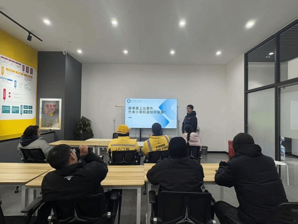 活动聚焦新就业群体权益保障和高强度工作压力疏导痛点展开。人工智能学院辅导员(法学硕士,2021年获国家法律职业资格证书A证)结合律所实习积累的实务经验,围绕新业态下骑手劳动权益保护典型案例,用通俗易懂的语言解读相关法律法规,讲解合法维权路径与风险防范技巧,帮助骑手们清晰认知自身合法权益,掌握应对劳动纠纷的实用方法。